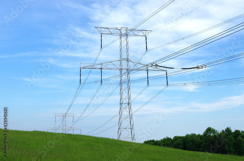 High voltage eletrical towers and lines with blue sky and green meadow. Eletricity towers on a green field. High-voltage transmission lines. Electricity transmission towers.