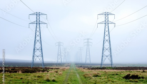 High voltage power lines and transmission towers stretching into the distance across a foggy rural landscape, symbolizing energy and infrastructure.