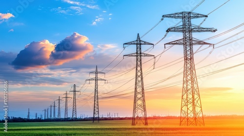 power, electricity, sunset, landscape, energy, transmission, line, infrastructure, nature, field, horizon, sky, cloud, technology, tower, rural, plant, environment, wire, lighting, scenic, view, bright, colourful, outdoors, industry, current, utility, evening, scene, calmness, growth, green, summer, beautiful, clear, electric, connection, fresh, serene, beauty, modern, architecture, natural, expansive, dramatic