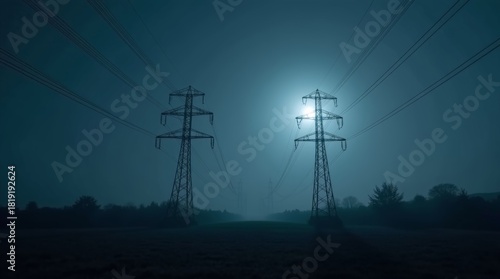 blackout, power, tower, night, moon, electricity, fog, landscape, grid, voltage, transmission, line, silhouette, energy, structure, dark, mist, eerie, industrial, cable, horizon, moonlight, terrain, field, quiet, sky, haunting, infrastructure, metal, cold, wide, solitude, network, shadow, rural, expanse, nocturnal, dim, atmospheric, bleak, connection, distance, emptiness, stark, dusk, wire, stillness