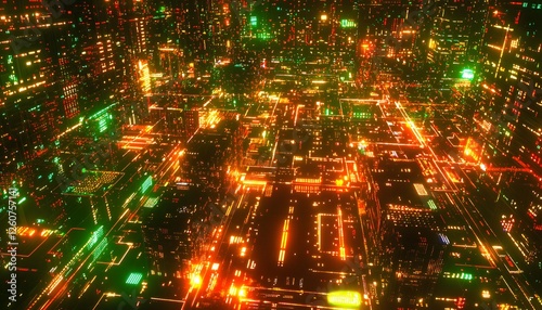 High-angle view of a glowing futuristic city grid at night, bold neon patterns creating cinematic surrealism