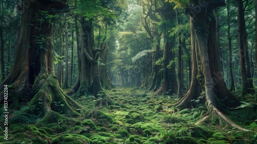 High-end photography of a dense, ancient forest with towering trees and a carpet of moss