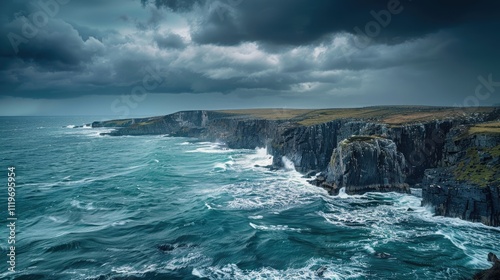 High-end photography of a dramatic coastline with rugged cliffs and crashing waves under a stormy sky