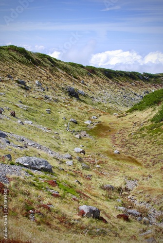Highland in autumn time with mountain range and grass field above the cloud level in sunshine day