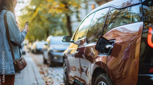Highlighting the convenience of electric car sharing with a photo of people unlocking a vehicle using a smartphone app.