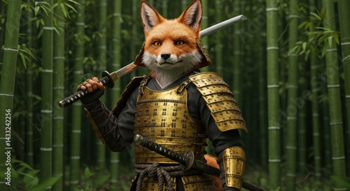 Highly detailed 3D render of an anthropomorphic red fox character dressed in ornate, traditional Japanese samurai armor (detailed plating, helmet)