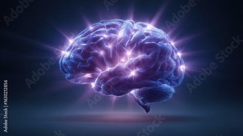 Highly detailed and vibrant digital illustration of a human brain glowing with purple electric energy and neural connections against a dark background