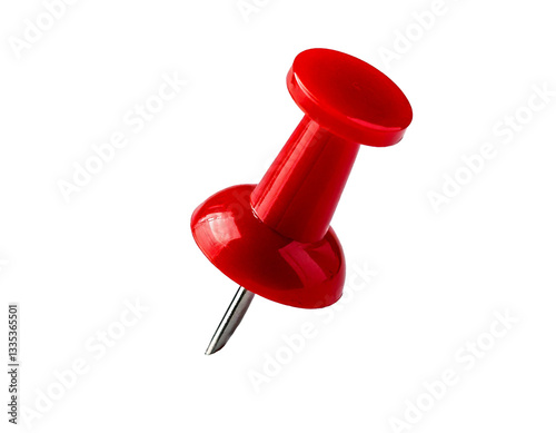 Highly realistic red push pin with a sharp metal tip designed for marking locations or pinning notes on white surfaces, isolated on a clean background. This photo can be used for business presentation
