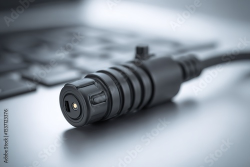 High-quality black connector on a sleek metallic surface near a computer keyboard showing modern technology in use