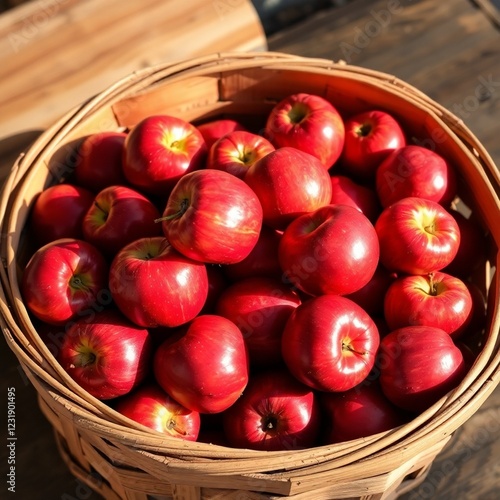 High-resolution commercial-quality stock photo A rustic wooden basket brimming with red apples, showcasing a variety of sizes and shades of red. The image should have a warm, inviting tone.
