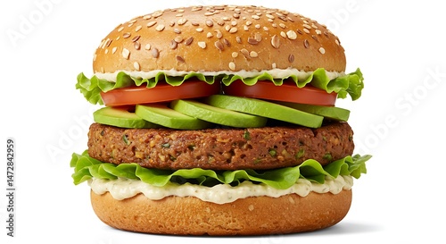 High-Resolution Image of Gourmet Vegetarian Burger Featuring Colorful Veggie Patty and Fresh Toppings in Seamless White Backdrop under Soft Even Light