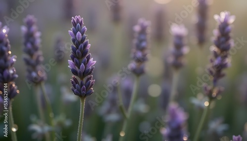 High-resolution macro of lavender stems with morning dew drops, shallow depth of field, natural tones