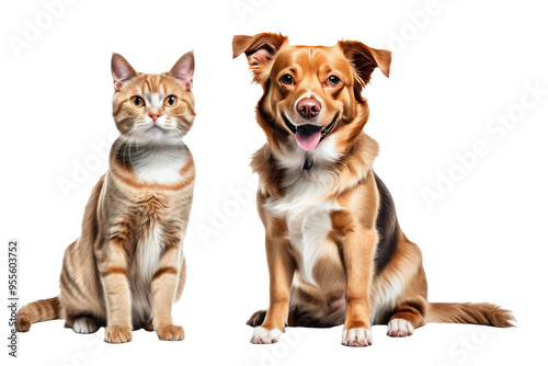 High-resolution stock photo capturing a content cat and dog side by side, exuding joy, seamlessly juxtaposed against a pure white or transparent backdrop, emphasizing their harmonious coexistence