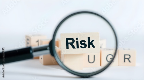 High-resolution stock photo, soft pastel colors, gentle soft light. A magnifying glass focuses on a wooden cube with Risk in bold black lettering. Surrounding cubes are blurred.