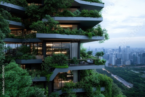 High-rise building featuring contemporary design and green terraces, blending nature with urban living and offering stunning views of the cityscape below.