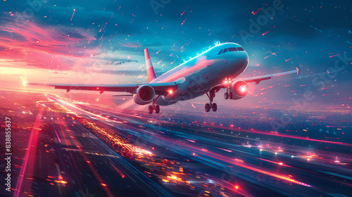 aerial, cargo, delivery, plane, high speed, take-off, dusk, city, light, transportation, logistic, aviation, fast, flight, sky, aircraft, urban, motion, efficiency, aeroplane, futuristic, skyline, night, service, technology, glowing, modern, dynamic, freight, departure, illuminated, high technology, speed, movement, advanced, agile, performance, swift, ai