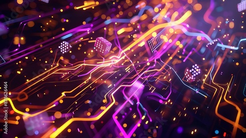 futuristic, computer, datum, center, dynamic, colourful, advertising, technology, concept, digital, art, design, modern, innovation, motion, energy, electronic, hardware, component, science, virtual, cyber, network, connectivity, animation, graphic, illustration, creative, styling, composition, background, visual, communication, abstract, circuit, board, wire, chips, dice, flying, high speed, blurred, dark, space