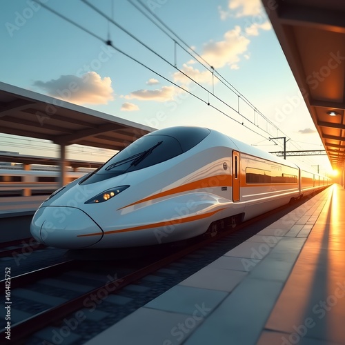 High-Speed Train Arriving at Sunset Station