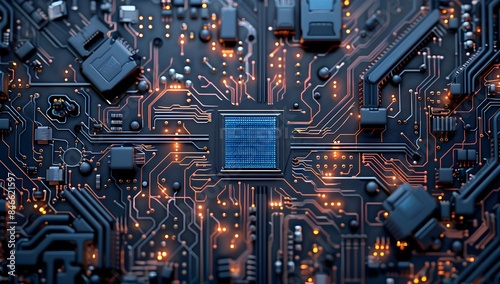 High-tech circuit board with black and blue tones, showcasing advanced microchips and circuits on the surface of an intricate electronic design
