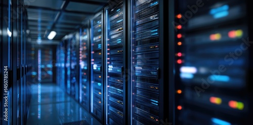 High-tech data center interior with modern server racks and vibrant LED lights, perfect for themes of networking, cloud computing, and infrastructure