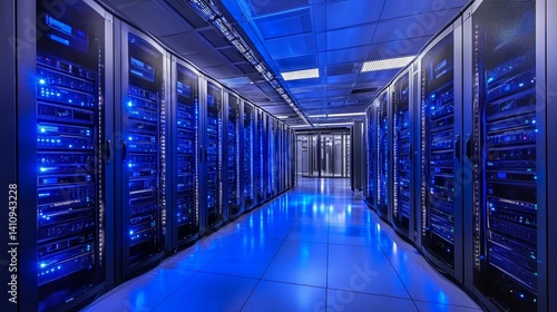 High-tech data center with rows of blue-lit server cabinets, illustrating advanced cloud computing infrastructure, big data services, and modern digital technology environment