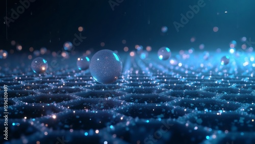 High-Tech Dimensional Grid Background: Abstract Science, Data Flow, and Futuristic Technology Concept with Glowing Particles and Orbs