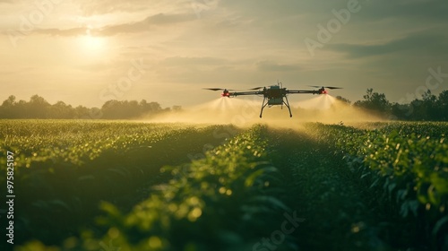 High-tech drone spraying fertilizer over a field of crops, with mist drifting through the air.