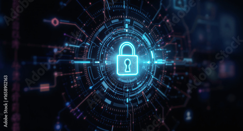 high-tech glowing lock interface in dark background, digital security access panel, sci-fi design
