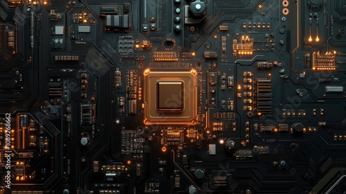 High-tech PCB with illuminated microchip processor and intricate circuit design, showcasing modern electronic technology and intricate details.