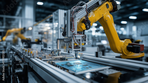robot, arm, assembly, factory, microchip, laser, precision, automated, industry, futuristic, machine, tech, engineering, metal, system, robotic, electronic, production, tool, industrial, technology, device, mechanical, innovation, component, manufacturing, automation, process, hardware, workshop, control, sensor, advanced, circuit, mechanism