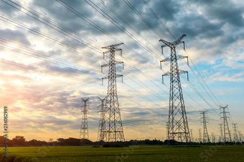 high-voltage power lines at sunset,high voltage electric transmission tower