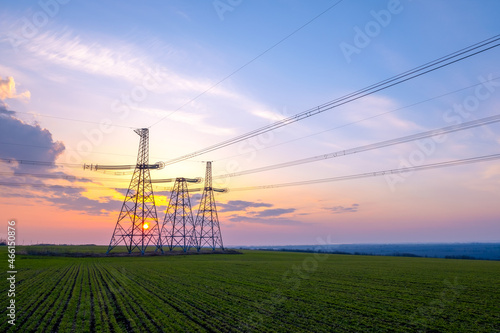 High-voltage power lines on the background of the evening sky. Transmission of electricity by means of poles through agricultural land.