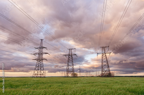 High-voltage power lines passing through a green field, on the background of a beautiful cloudy sky