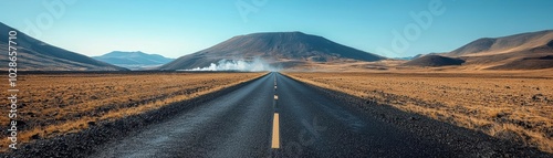 Highway through a barren volcanic landscape, black rocks and distant steam vents under a bright, clear sky Highway landscape, Volcanic terrain
