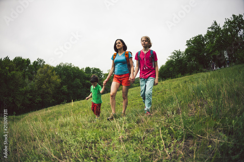 active, woman, hiking, nature, backpack, hike, forest, activity, tour tourism, summer, leisure, travel, mother, adventure, children, children, walking, family, holiday maker, vacation, people, son, girl, little, boy, backpacker, green, landscape, eltern, mother, path, trip, road, traveling, field, hiker, meadow, group, journey, person, park, walk, tracking, children, 2, arm, together, hand, three