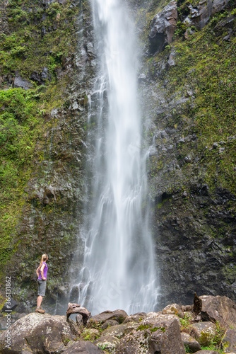 hawaii, kauai, us, one person, people, woman, adult, waterfall, flowing water, water, long exposure, cliff, landscape, rock formation, rock, standing, nature, woman, adult, female, female, person, waterfall, fall, fall, fresh, freshness, pure, purity, cascade, outside, landscape, daytime, cliff, 30s