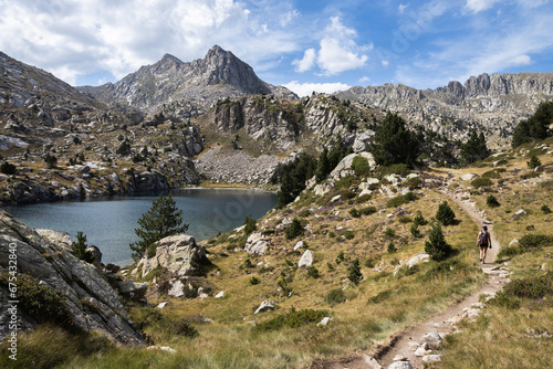 Hiker in a beautiful landscape of the natural park of Aigestortes y Estany de Sant Maurici, Pyrenees valley with river and lake