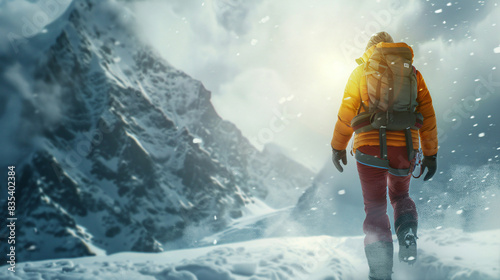 Hiker in a yellow coat hikes through a snowy mountain scenery as the sun sets