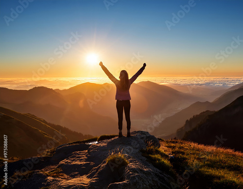 Hiker is celebrating reaching the summit by raising her arms in the air as the sun sets