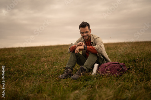 hiker, hiking, watch, time, man, male, person, sitting, grass, field, meadow, nature, outdoors, cloudy, overcast, sky, day, backpack, thermos, travel, adventure, journey, exploration, trekking, active, lifestyle, healthy, fitness, recreation, leisure, freedom, solitude, peace, calmness, landscape, scenery, countryside, rural, cloud, weather, autumn, fall, clothing, gear, equipment, smile
