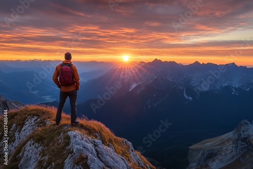 Hiker standing on mountain peak watching sunrise over dramatic mountain range and valleys