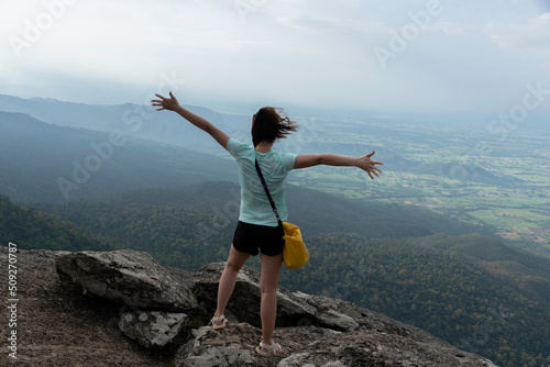 Hiker with backpack relaxing young woman and looking at amazing mountains and forest, wanderlust travel concept, space for text, atmospheric epic moment hiking holiday
