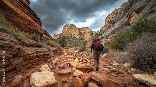hiking, trail, backpack, canyon, rock, mountain, nature, adventure, travel, landscape, outdoors, scenery, exploration, journey, path, person, walking, trekking, climber, wilderness, scenic, view, sky, cloud, storm, rocky, terrain, desert, red, stone, hill, climb, expedition, active, movement, footwear, pole, gear, solo, summer, spring, fall, autumn, day, light