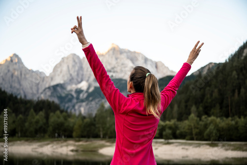Hiker with raised arms in triumph standing in beautiful nature
