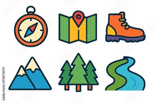 Hiking and outdoor linear icons set. featuring compass, map, boots, mountains, forest, and river symbols