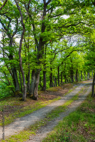 Hiking trail through a shady forest in the Rheingau Mountains on a sunny spring day