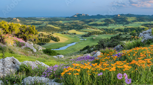 Hilltop wildflowers, valley vista, sunset, travel poster