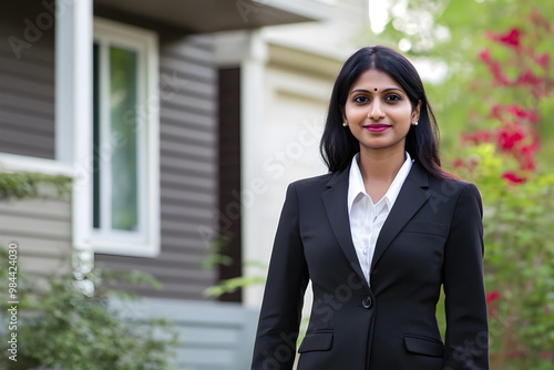 Hindu Woman in Suit, Real Estate House Background, Professional Portrait