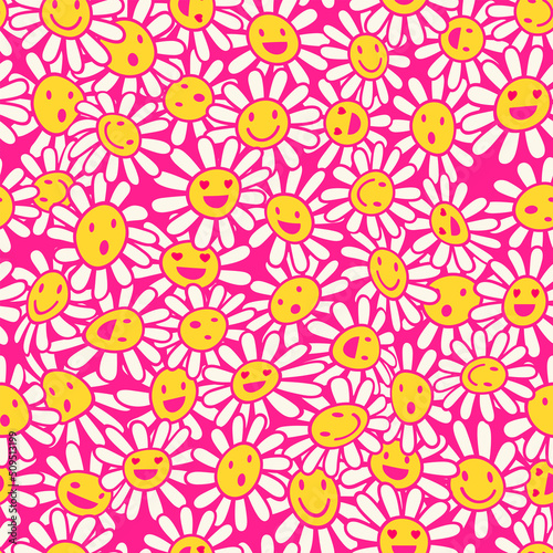 Hippie vector seamless pattern. Old school psychedelic background with smile faces in chamomile flowers. Nostalgia retro 70s groovy print. Colorful textile and surface design