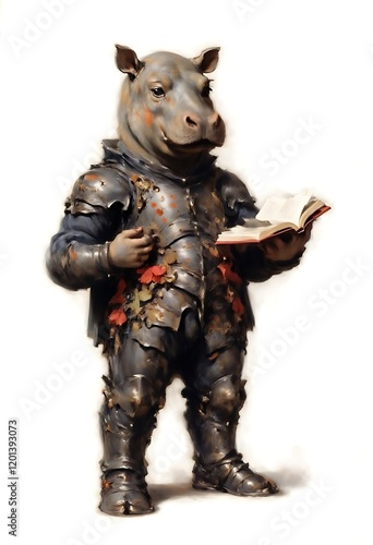 hippopotamus, knight, armoring, book, reading, fantasy, art, artwork, illustration, digital artwork, painting, whimsical, cute, funny, charming, autumn, leaf, mediaeval, soldier, warrior, hero, story, tale, literature, magic, mythical, creature, animal, character, design, fantasy art, wallpaper, print, poster, buy, purchase, download, hi-res, image, photo